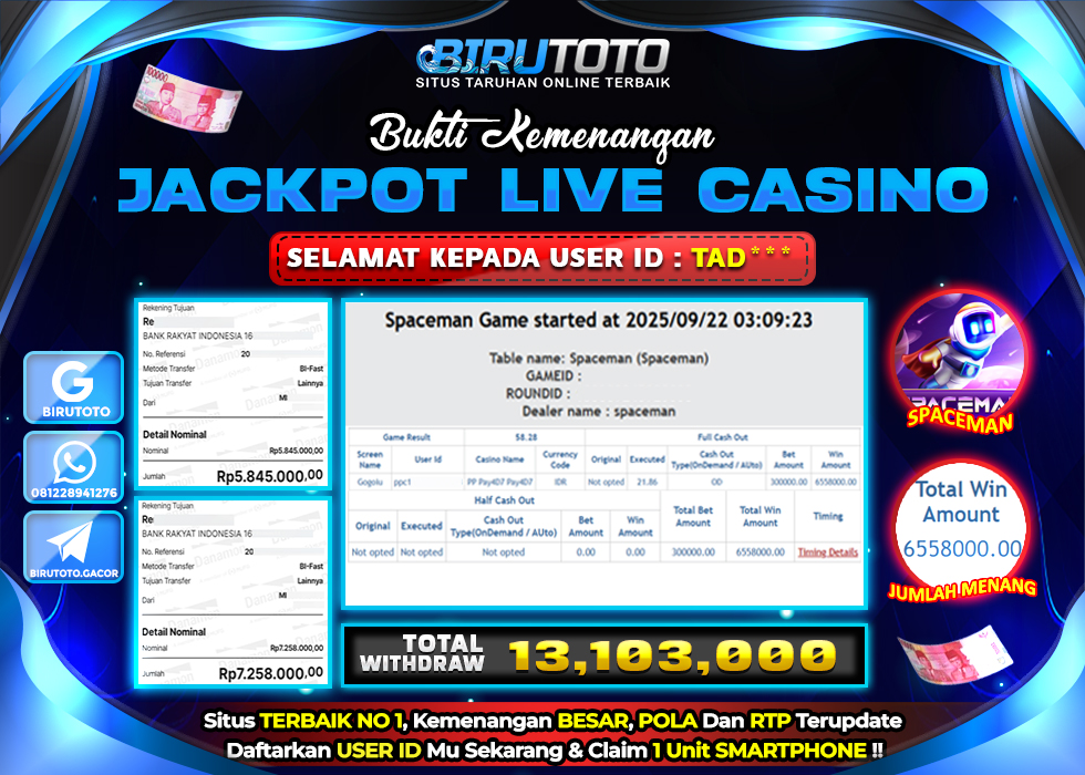 Bukti JP Live Casino Member Birutoto 22 September 2025