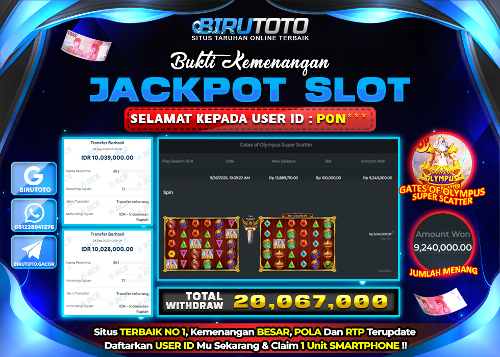 Bukti JP Slot Gates Of Olympus Super Scatter BIRUTOTO 28 September 2025 Rp 20.067.000,- LUNAS