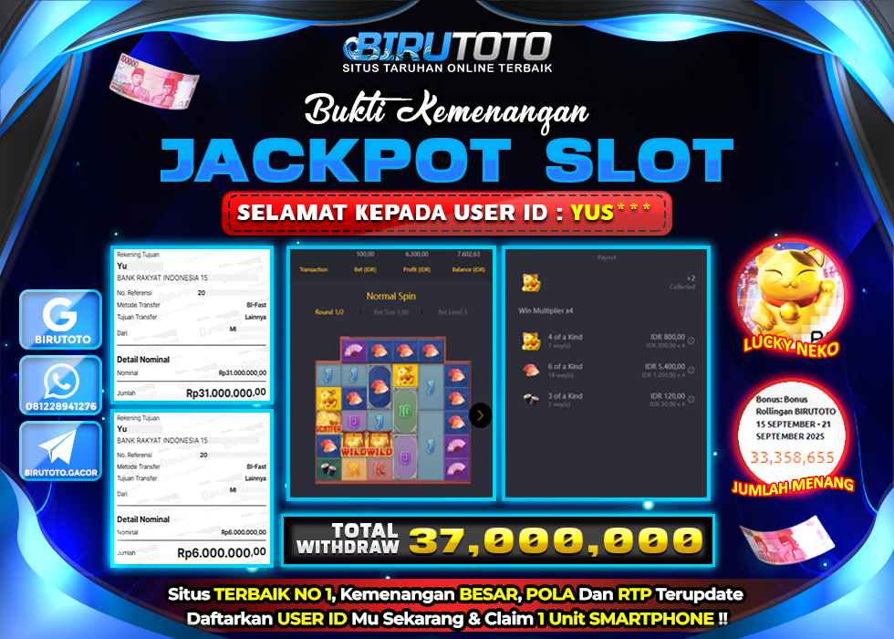 Bukti JP Slot Lucky Neko BIRUTOTO 22 September 2025 Rp 37.000.000,- LUNAS