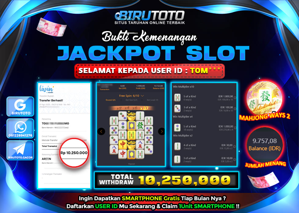Bukti JP Slot Mahjong Ways 2 BIRUTOTO 29 Agustus 2025 Rp 10.250.000- LUNAS