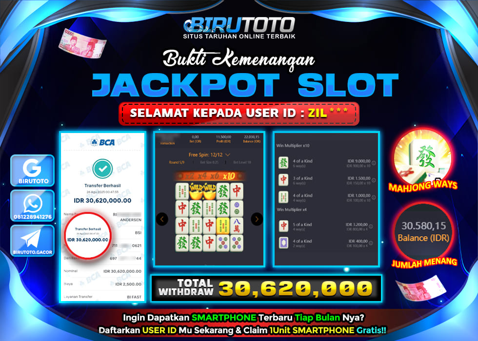 Bukti JP Slot Mahjong Ways BIRUTOTO 26 Agustus 2025 Rp 30.620.000- LUNAS