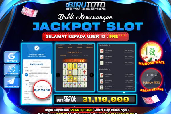 Bukti JP Slot Member Birutoto 19 November 2025 BUKTI JP MEMBER BIRUTOTO DEPOSIT : Rp 800.000 TOTAL WITHDRAW : Rp 25.000.000 GAME : PG SOFT – Mahjong Ways Memenangkan Jackpot Permainan slot online di BIRUTOTO sangat populer di kalangan pemain judi online di seluruh dunia. Di Indonesia sendiri, slot online menjadi salah satu jenis…