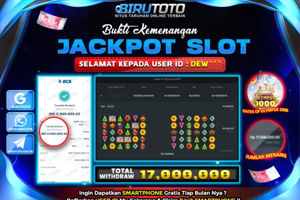 Bukti JP Slot  Member Birutoto 22 November 2025 BUKTI JP MEMBER BIRUTOTO DEPOSIT : Rp 300.000 TOTAL WITHDRAW : Rp 17.000.000 GAME : PRAGMATIC PLAY – GATES OF OLYMPUS 1000   Memenangkan Jackpot Permainan slot online di BIRUTOTO sangat populer di kalangan pemain judi online di seluruh dunia. Di Indonesia sendiri, slot online menjadi salah…