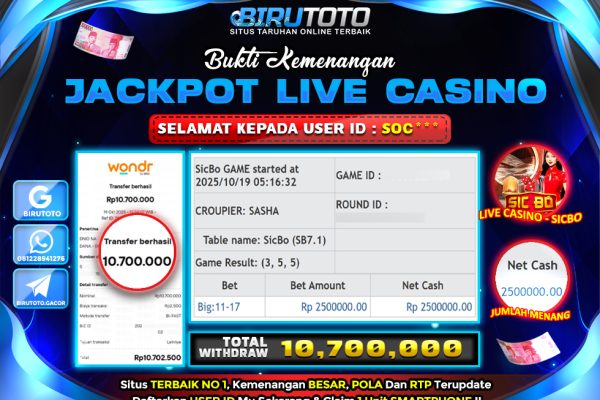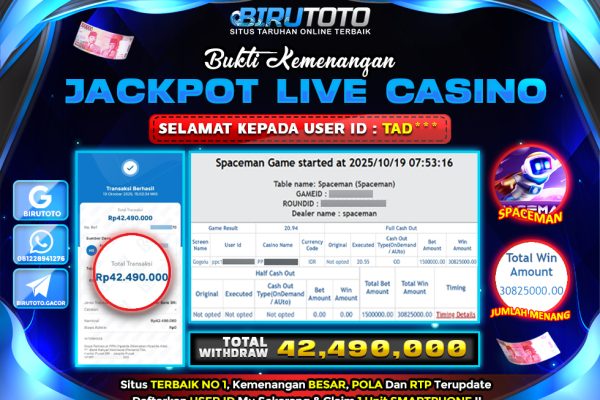 Bukti JP Slot Member Birutoto 23 Oktober 2025 BUKTI JP MEMBER BIRUTOTO DEPOSIT : Rp 250.000 TOTAL WITHDRAW : Rp 14.129.000 GAME : PG SOFT – ANUBIS WRATH Memenangkan Jackpot Permainan slot online di BIRUTOTO sangat populer di kalangan pemain judi online di seluruh dunia. Di Indonesia sendiri, slot online menjadi salah satu jenis permainan…